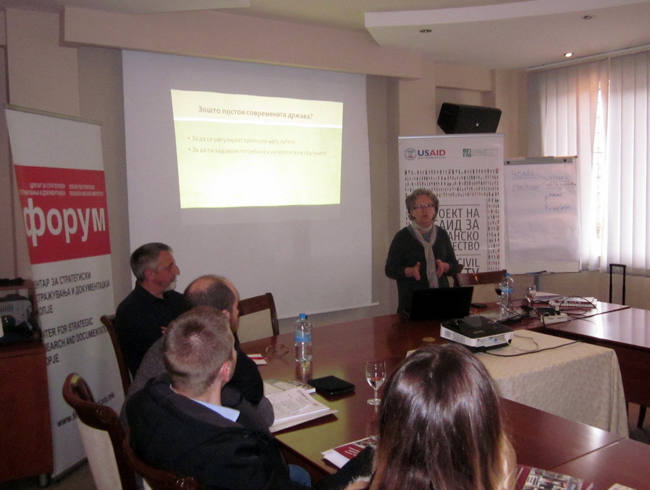 По паузата за ручек следуваше предавањето на професорката Мирјана Најчевска, на тема „Структура на општеството и местото на граѓанскиот сектор“ која ги објасни основните механизми на државата и што ја прави една држава демократска. Професорката дискутираше со учесниците за правата и слободите на граѓаните, за тоа што претставува граѓански сектор и улогата на граѓанскиот сектор во демократските општества. Предавањето на професорката Најчевска беше проследено со прикажување на документарниот филм за студентското движење Отпор во Србија